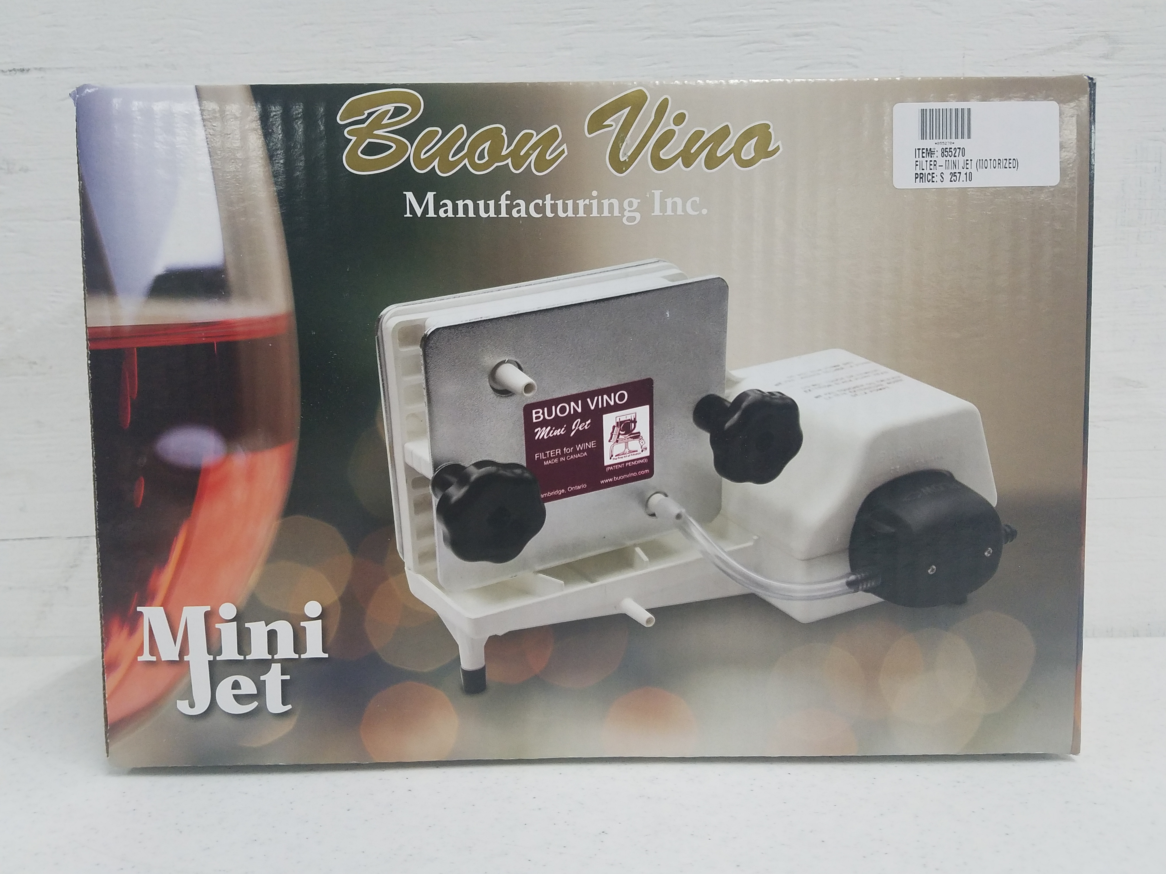 THE BUON VINO MINI JET HAS BEEN DESIGNED FOR THE SMALL QUANTITY HOME WINEMAKER TO PUT A COMMERCIAL QUALITY SHINE ON YOUR FINISHED WINE. A GREAT, ECONOMICAL WINE FILTRATION OPTION FOR THE HOME WINEMAKER WHO FILTERS BATCHES OF AROUND 5-6 GALLONS AT A TIME. ITS COMPACT DESIGN INCORPORATES A SELF-PRIMING MOTORIZED PUMP CAPABLE OF FILTERING UP TO 20 LITERS IN ABOUT 15 MINUTES. A BUILT-IN DRIP TRAY AND DRAINAGE TUBE ENSURE A NO MESS, NO FUSS CLEAN-UP JOB. AND ITS TRIPLE FILTER PAD SYSTEM ADDS A CRYSTAL CLEAR, SPARKLING QUALITY TO YOUR WINE.