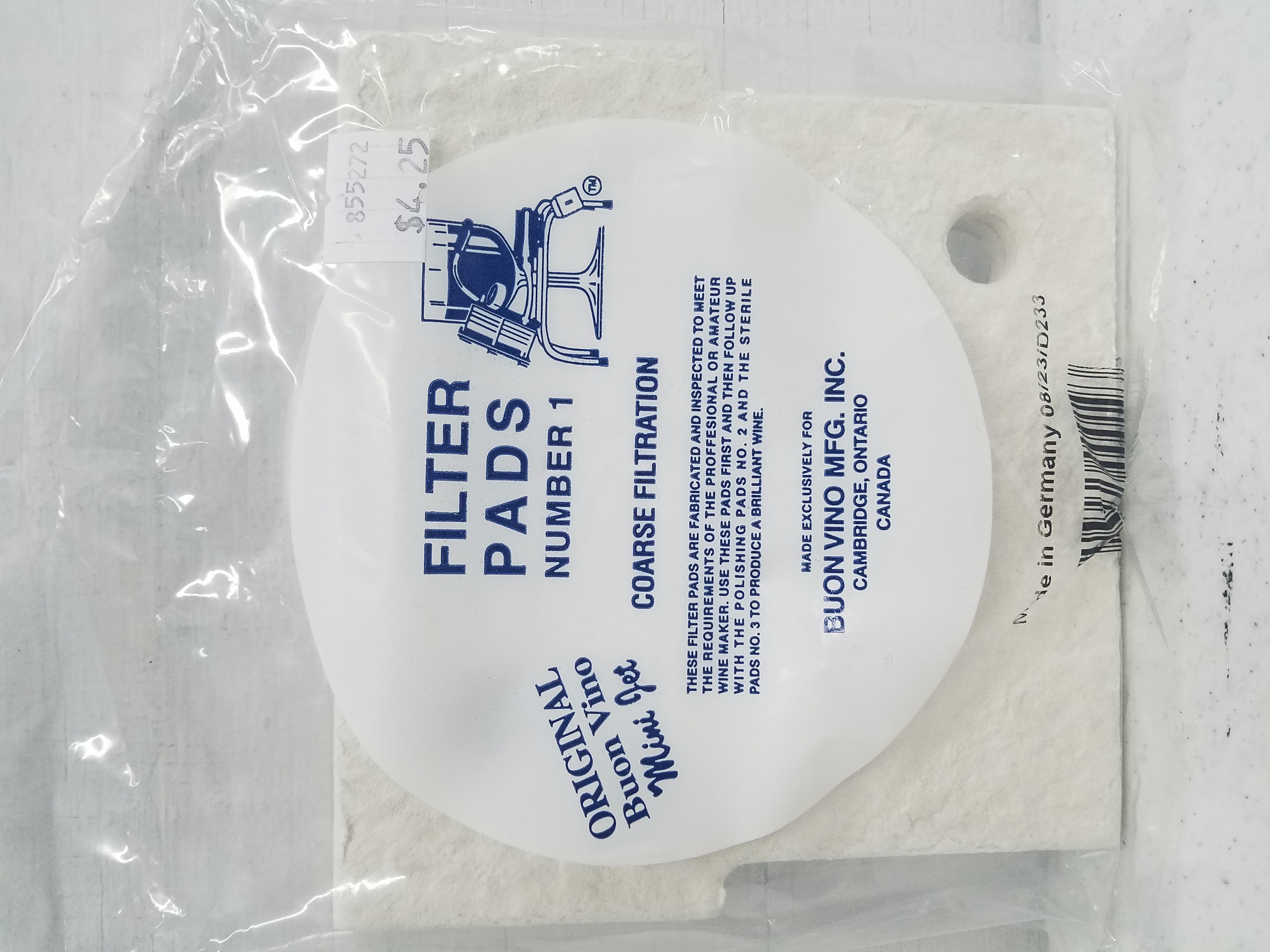 BUON VINO SUPER JET FILTER PAD #1 (COARSE); PACKAGE OF 3. BUON VINO FILTERS USE A 3 GRADE PAD SYSTEM. THE #1 COARSE PADS (6 MICRONS) ARE MAINLY USED FOR INITIAL CLEANING OF HEAVILY CLOUDED WINES. THESE PADS WILL NOT SHOW A SIGNIFICANT CHANGE IN YOUR WINE'S CLARITY. THIS WILL COME AFTER USE OF THE #2 AND #3 PADS. THE #1 PADS ARE USED TO COLLECT AND/OR BREAK DOWN LARGER PARTICLES.