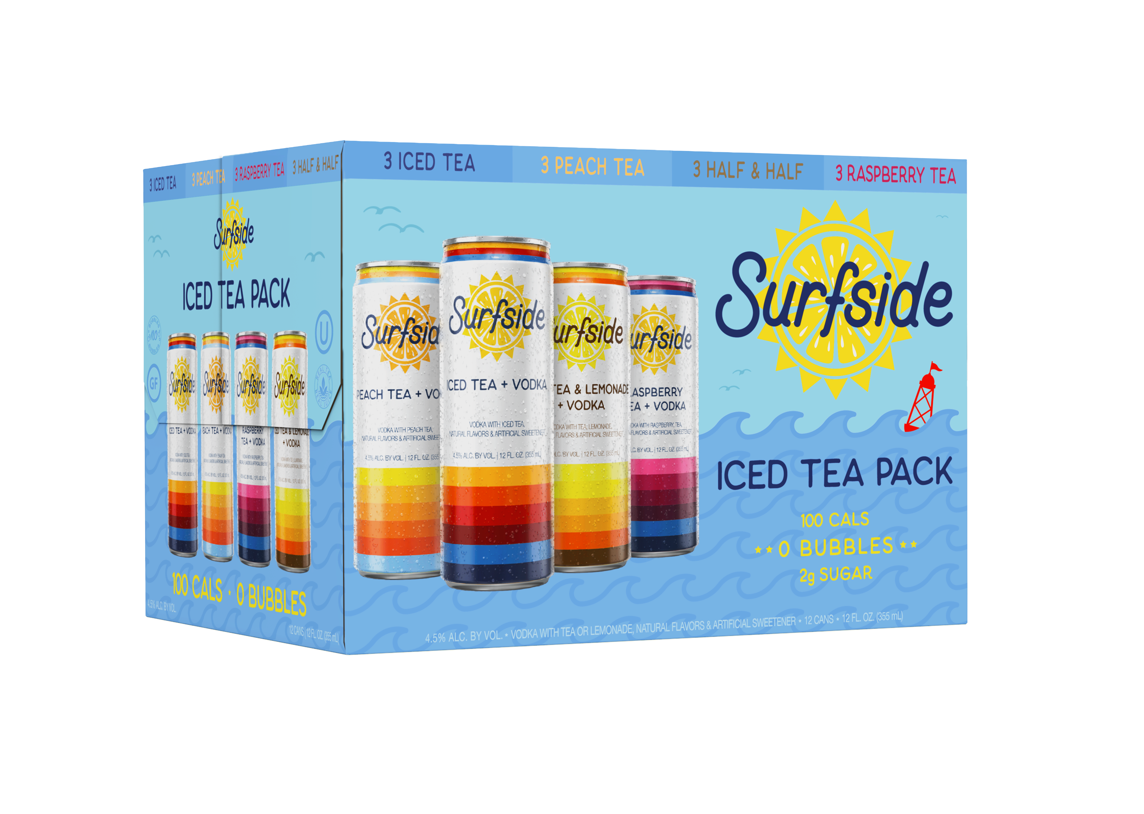 SURFSIDE ICED TEA PACK IS A DELICIOUS VARIETY, WITH EACH 12-PACK CONTAINING 3 CANS EACH OF THE ICED TEA, PEACH TEA, HALF & HALF, AND RASPBERRY TEA + VODKA! 100 CALORIES, ZERO BUBBLES, 2G SUGAR!